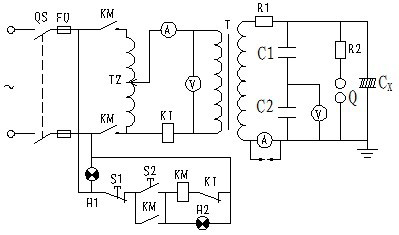 圖中KI為過電流繼電器,試驗過程中如被試設備絕緣擊穿,則過電流繼電器應動作,切斷試驗電源,避免損壞試驗設備;Q為球間隙,用于防止過電壓,試驗時一般調(diào)整為1.1~1.15倍的試驗電壓;R1為限流電阻,防止由于絕緣擊穿、放電時引起的大電流損壞高壓試驗變壓器;R2為阻尼電阻,防止由于球間隙放電引起的電壓振蕩。